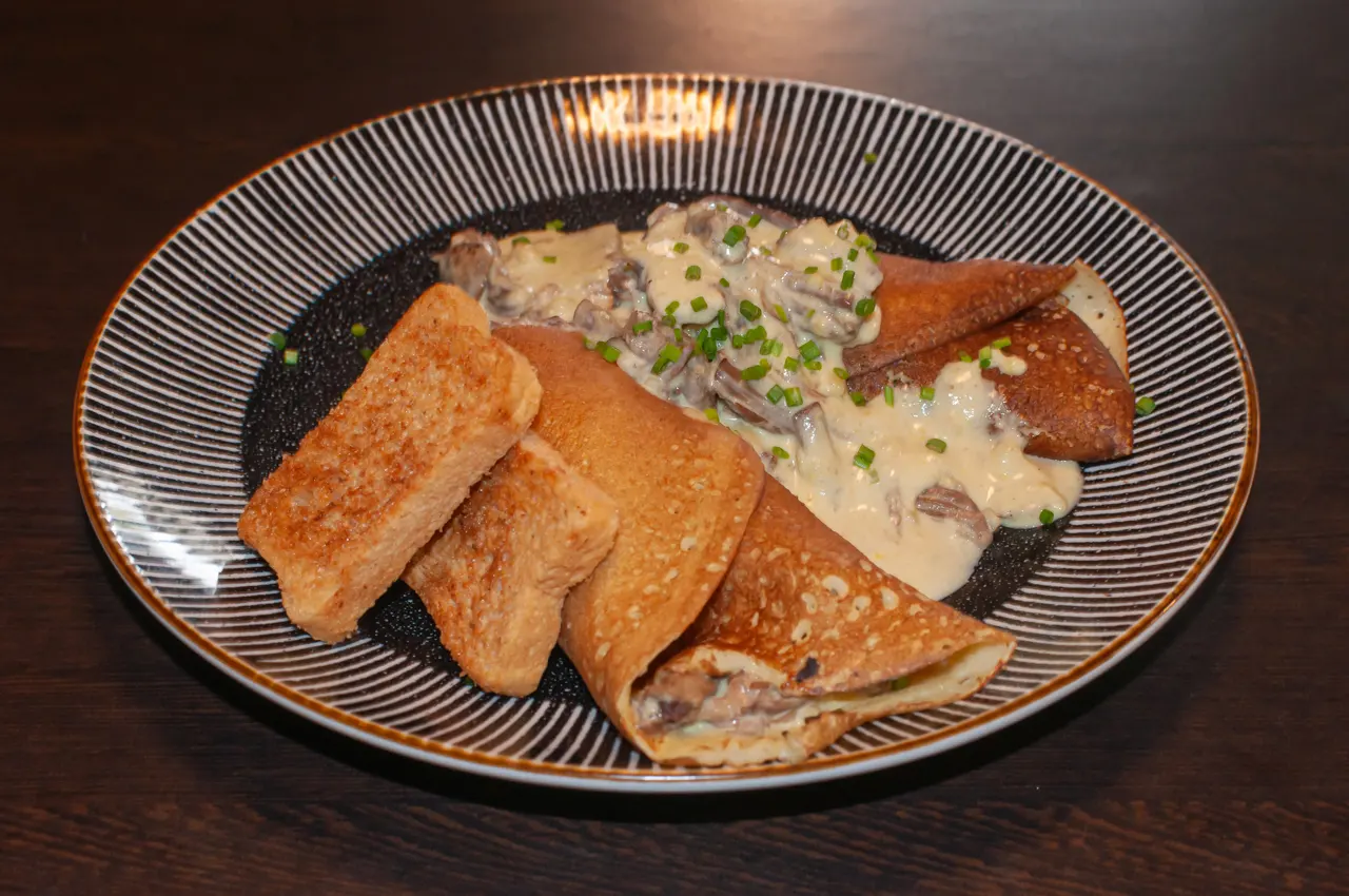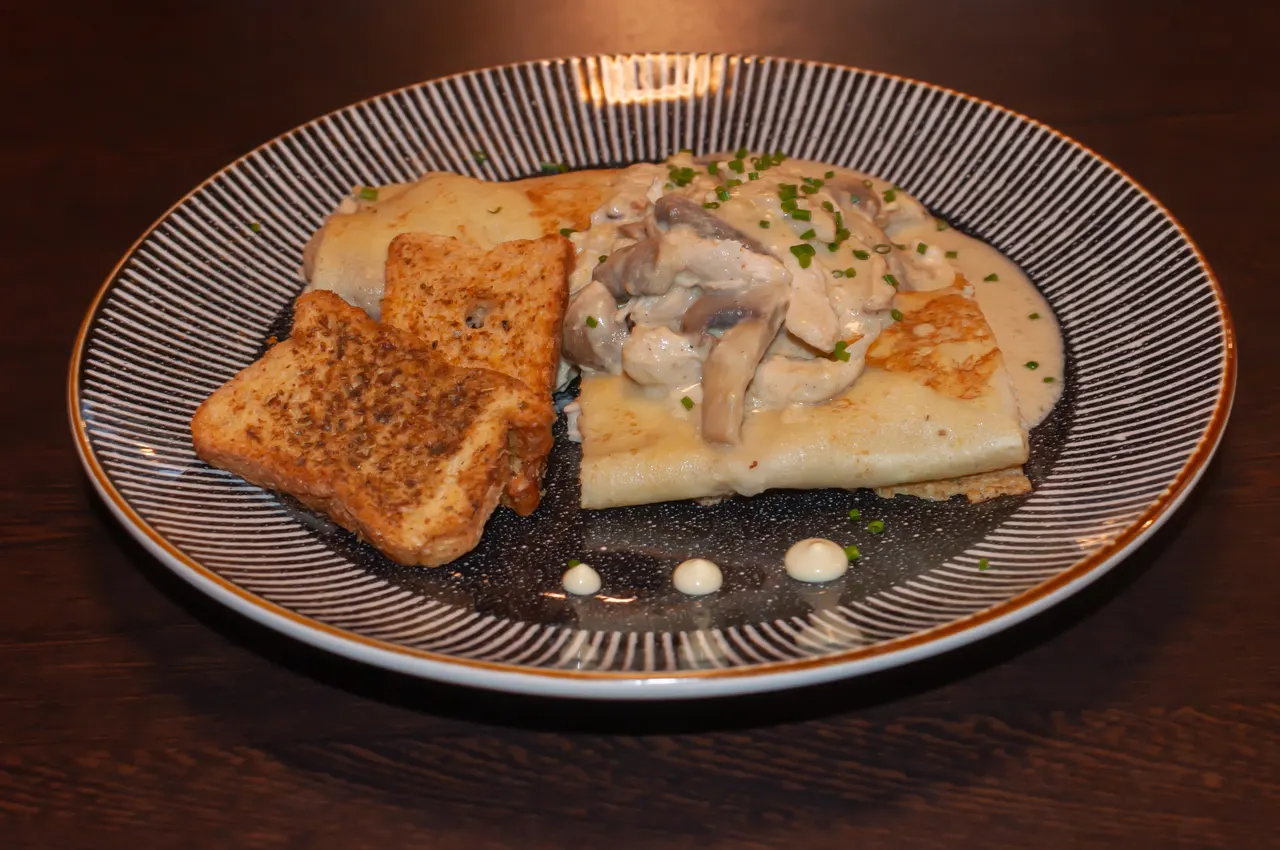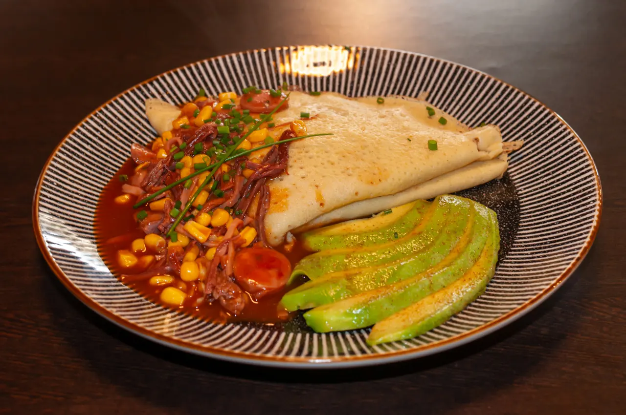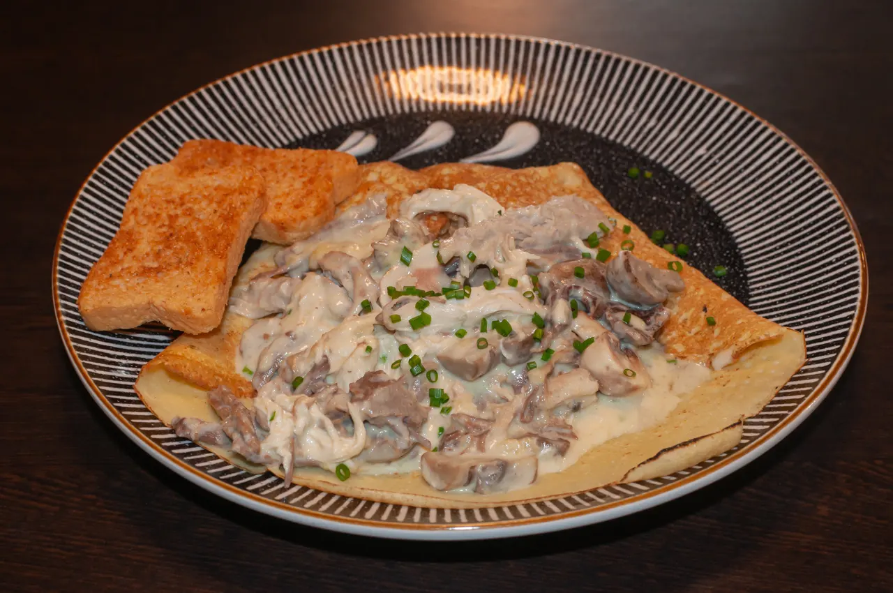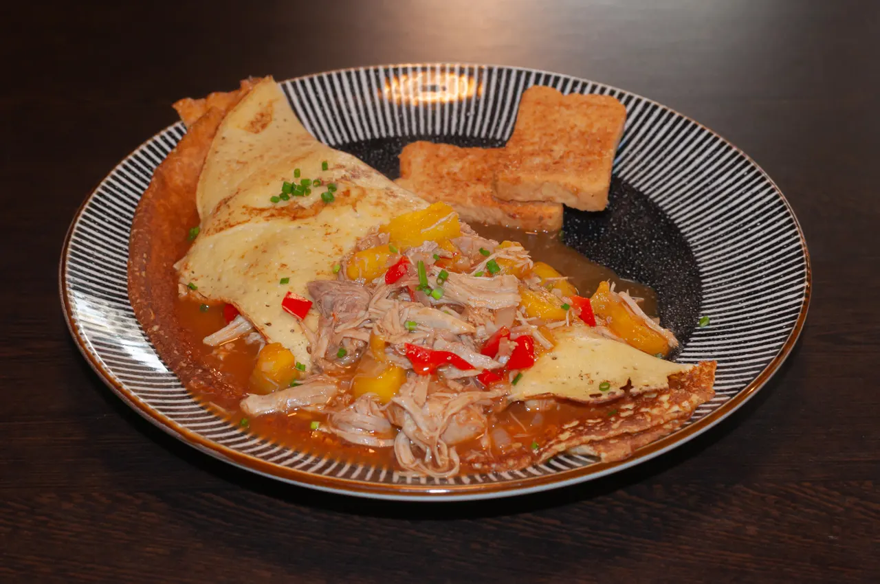¿No te decides? bueno, aquí tienes una crepe con carne mechada de res, pollo y cerdo, además de champiñones, todo en una salsa de jengibre y acompañado de tostadas al gusto.