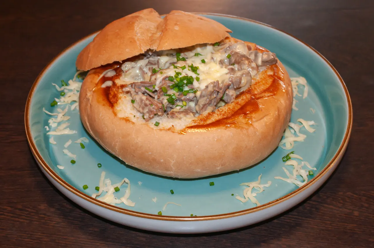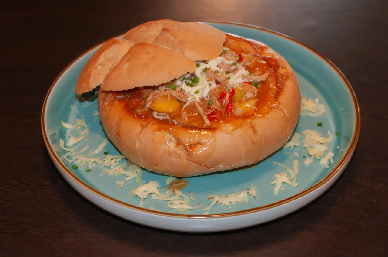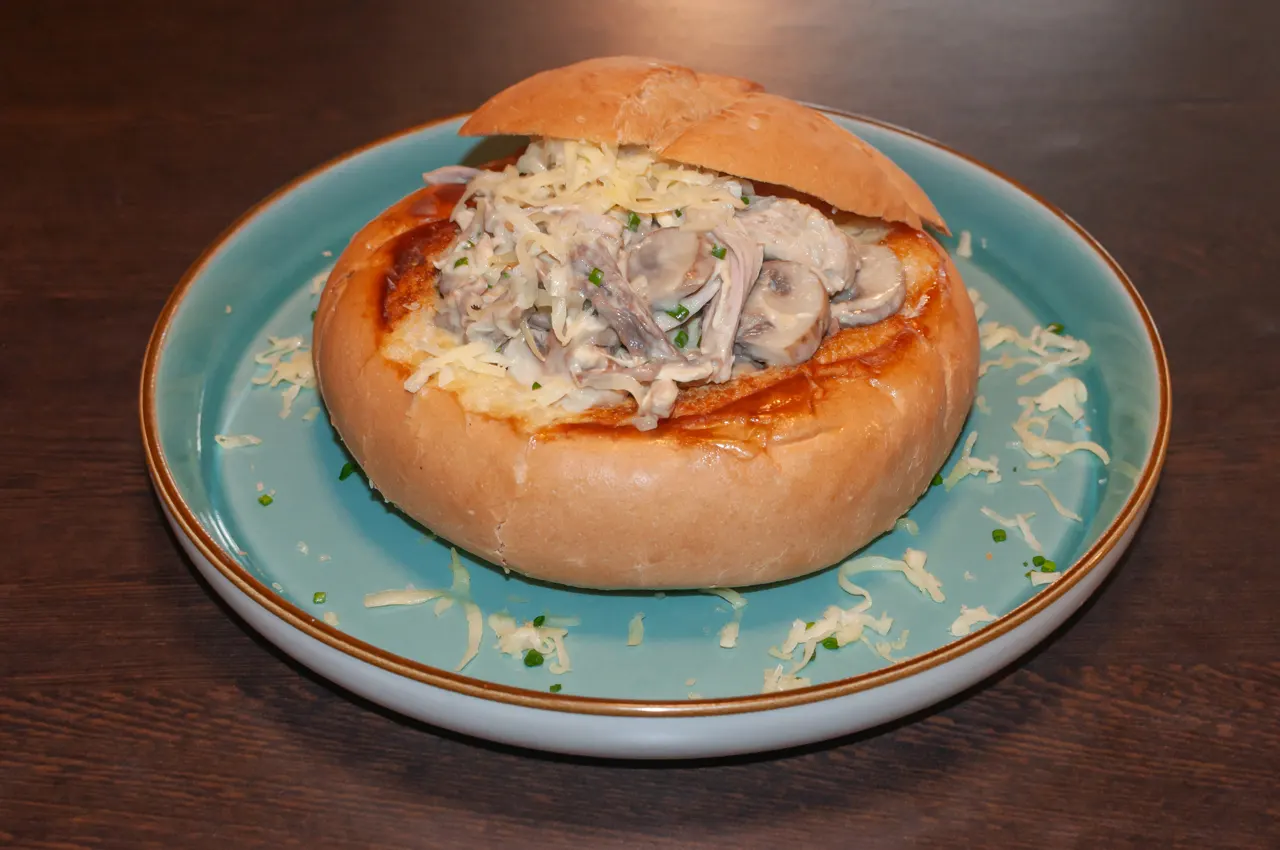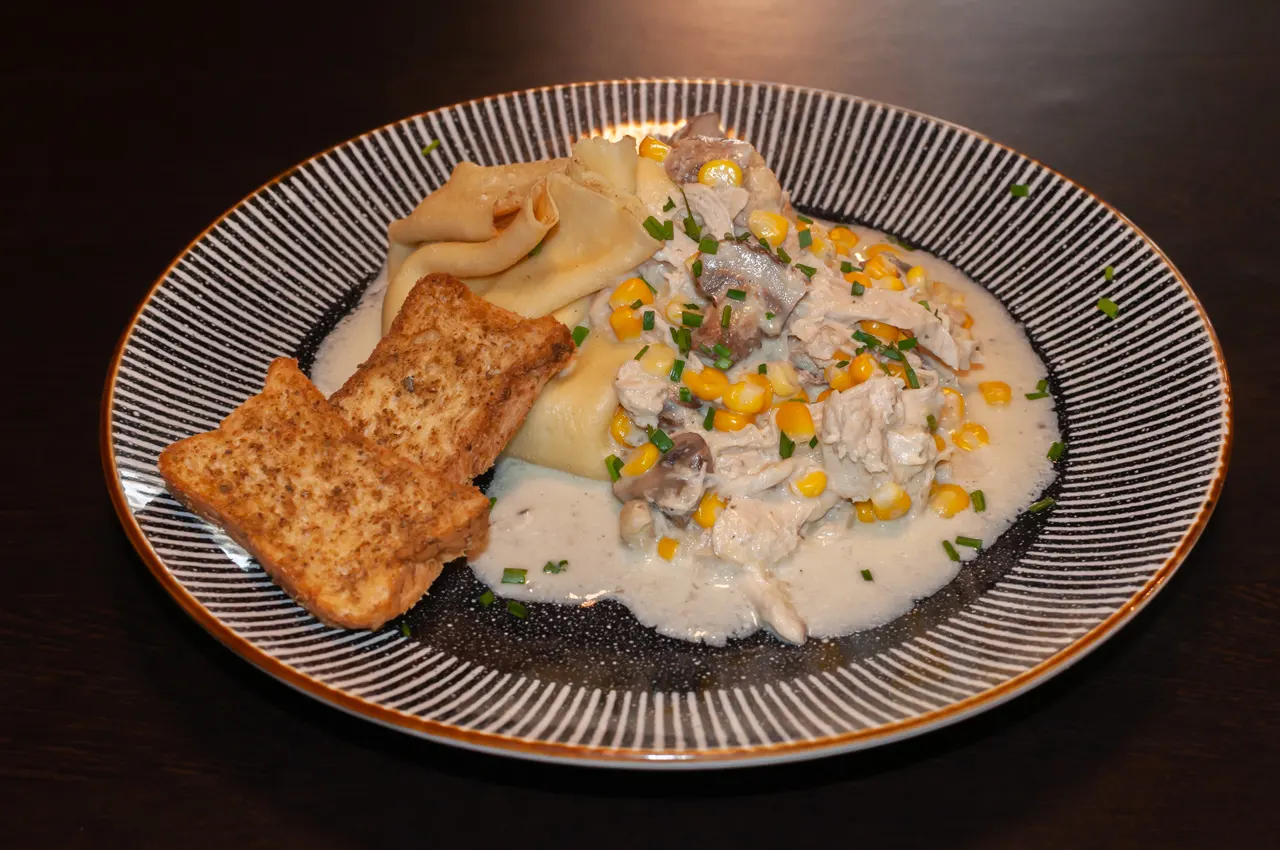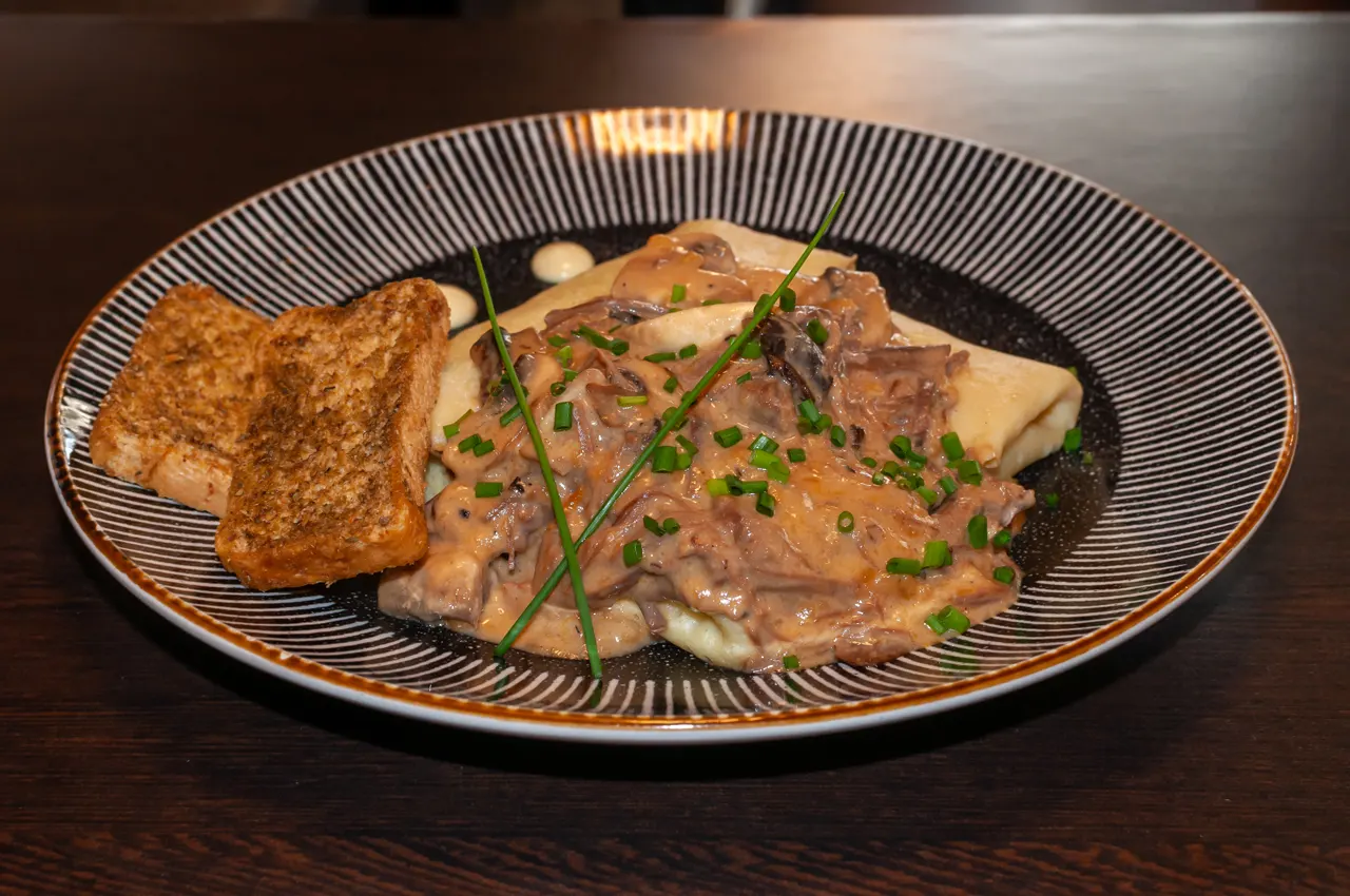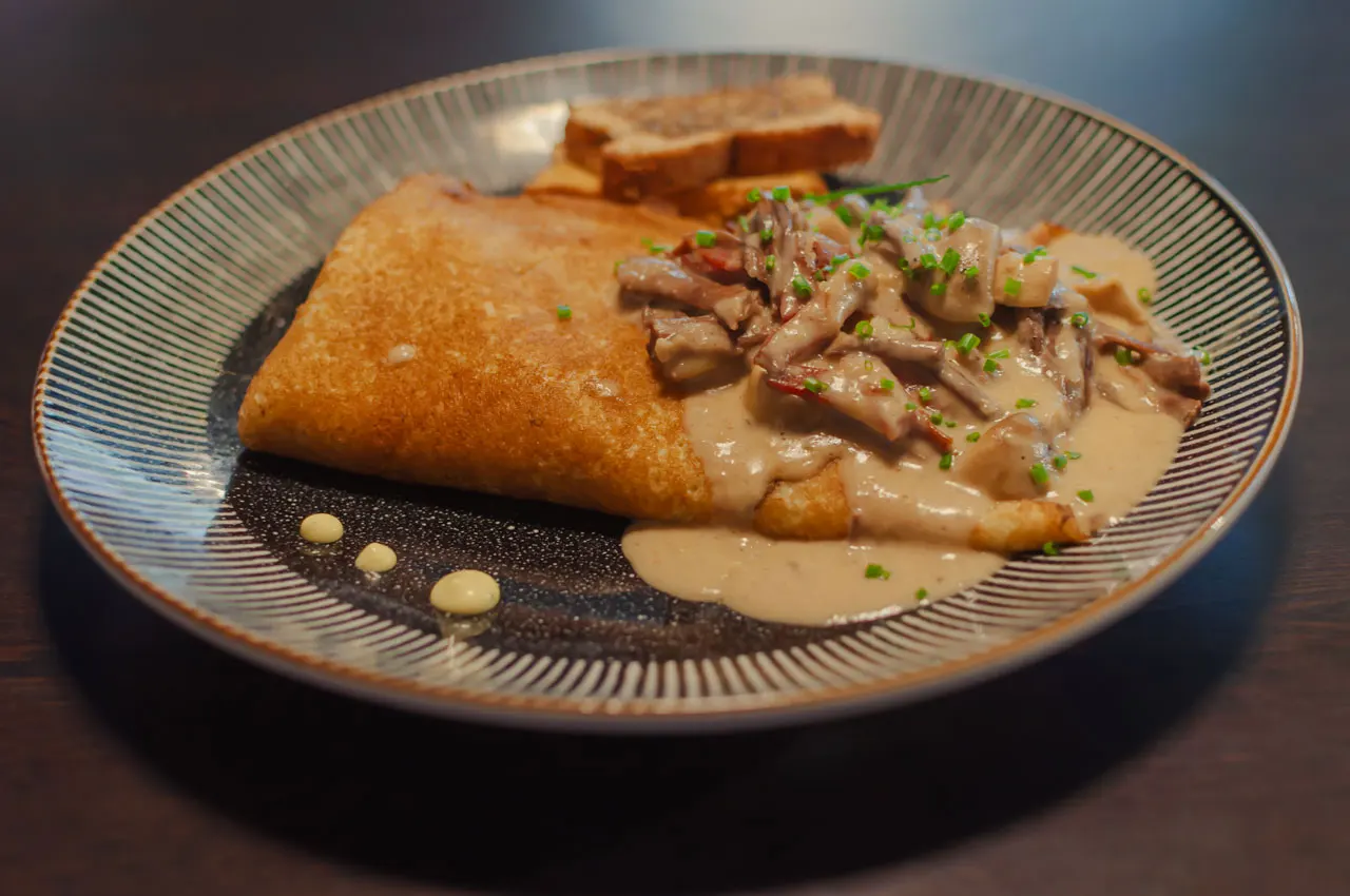 ¿No te decides? bueno, aquí tienes una crepe con carne mechada de res, pollo y cerdo, además de champiñones, todo en una salsa de jengibre y acompañado de tostadas al gusto.