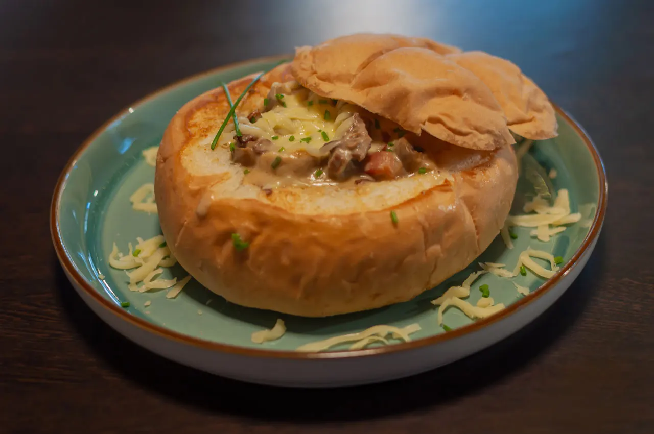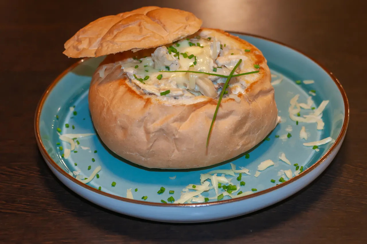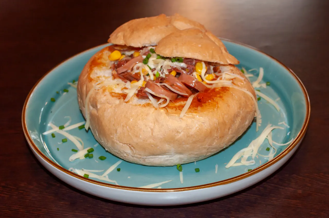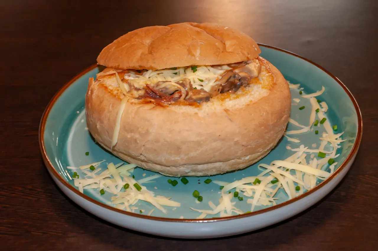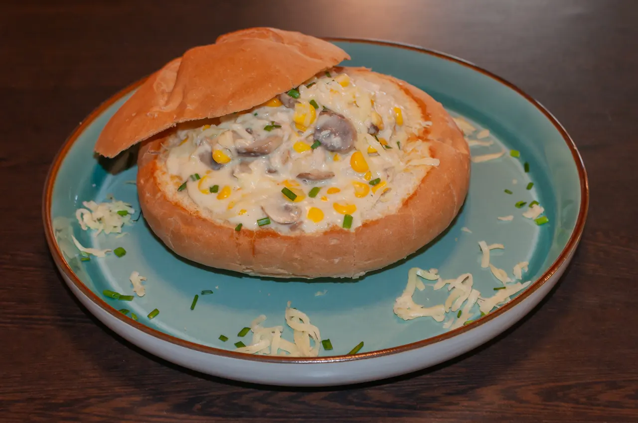 ¿No te decides? bueno, aquí tienes una crepe con carne mechada de res, pollo y cerdo, además de champiñones, todo en una salsa de jengibre y acompañado de tostadas al gusto.