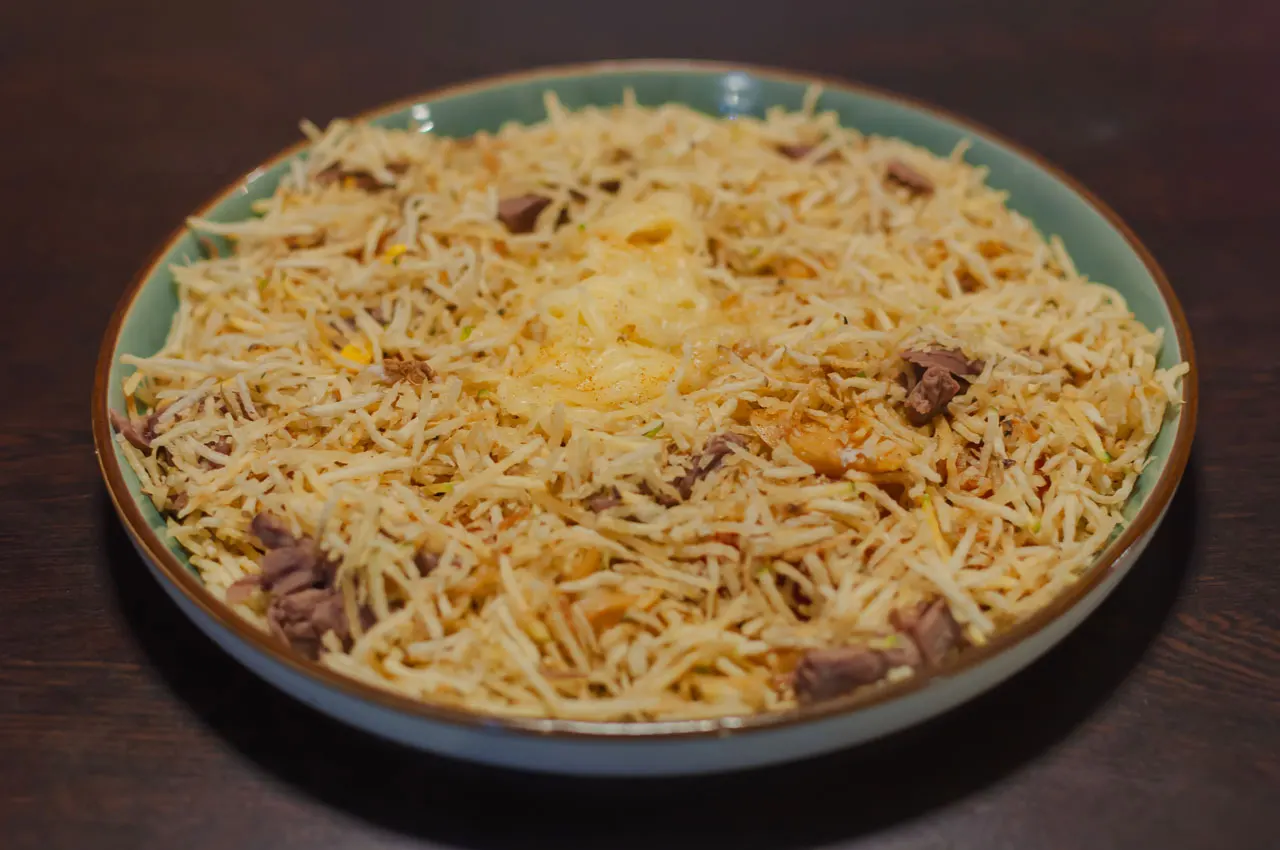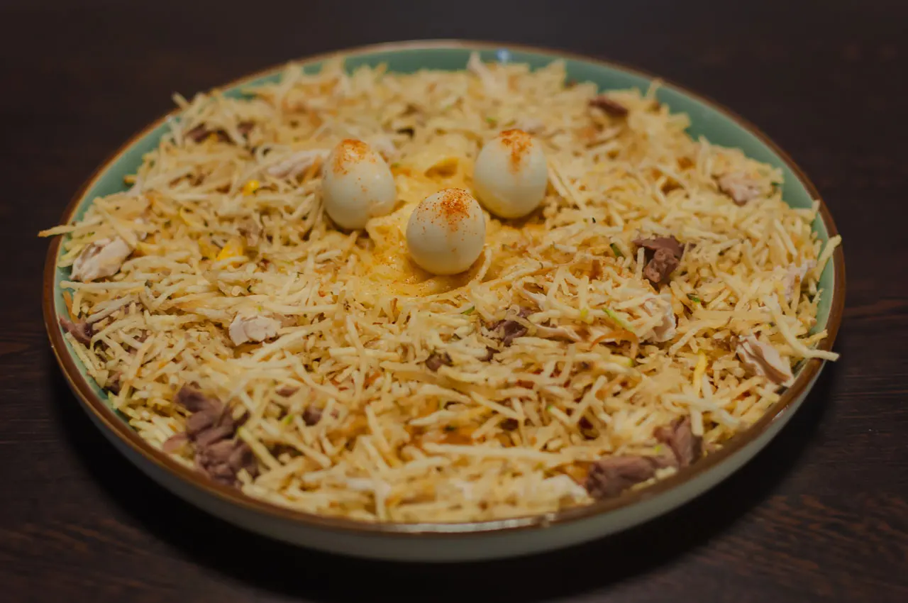Res mechada, salchicha artesanal de pollo, jamón ahumado, maíz tierno, papitas cabello de ángel y queso mozzarella.
