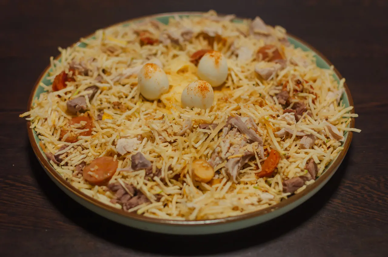 Pollo y res mechados, salchicha artesanal de pollo, jamón ahumado, longaniza artesanal, maíz tierno, papitas cabello de ángel, queso mozzarella y huevitos de codorniz.