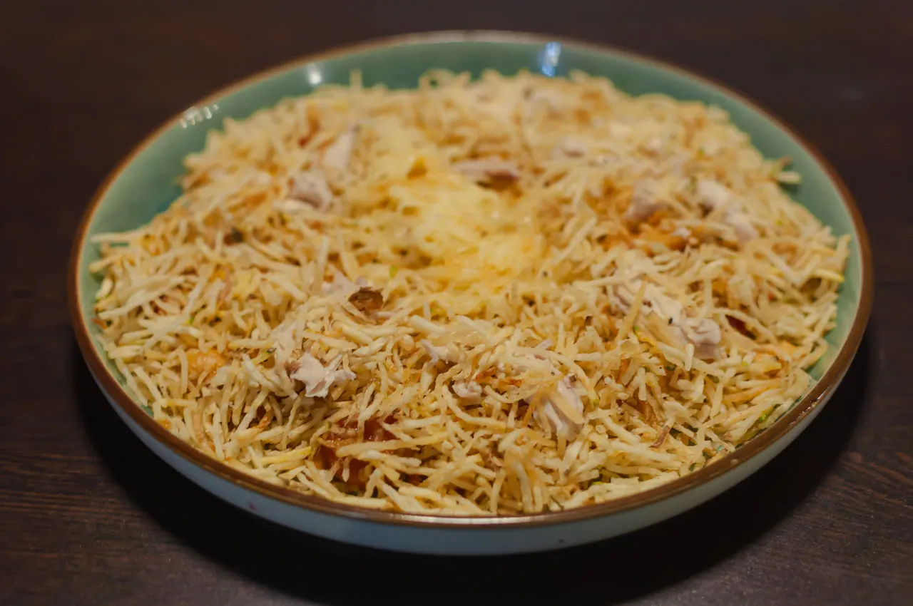 Pollo mechado, salchicha artesanal de pollo, jamón ahumado, maíz tierno, papitas cabello de ángel y queso mozzarella.